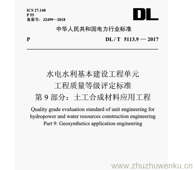 DL/T 5113.9-2017 pdf下载 水电水利基本建设工程单元 工程质量等级评定标准 第9部分:土工合成材料应用工程。Quality grade evaluation standard ofunit engineering for hydropower and water resources construction engineering Part 9: Geosynthetics application engineering.