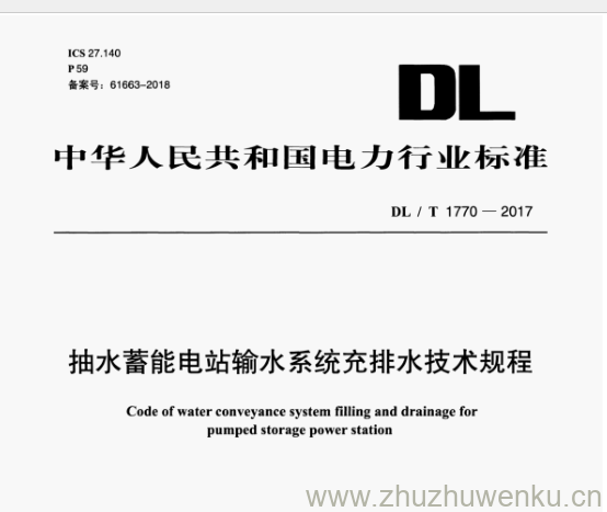 DL/T 1770-2017 pdf下载 抽水蓄能电站输水系统充排水技术规程。Code of water conveyance system filling and drainage for pumped storage power station.