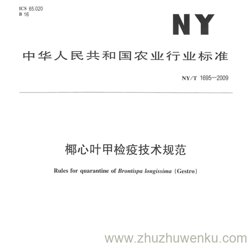 NY/T 1685-2009 pdf下载 椰心叶甲检疫技术规范。 Rules for quarantine of Brontispa longissima (Gestro) .