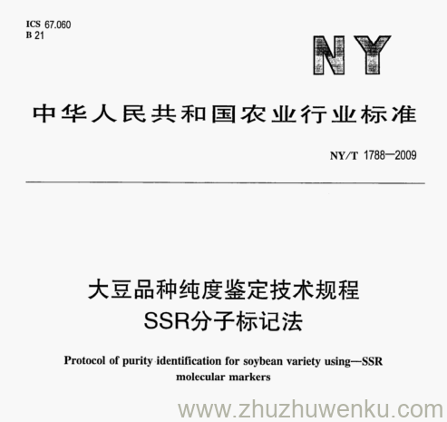 NY/T 1788-2009 pdf下载 大豆品种纯度鉴定技术规程 SSR分子标记法。 Protocol of purity identification for soybean variety using- SSR molecular markers .
