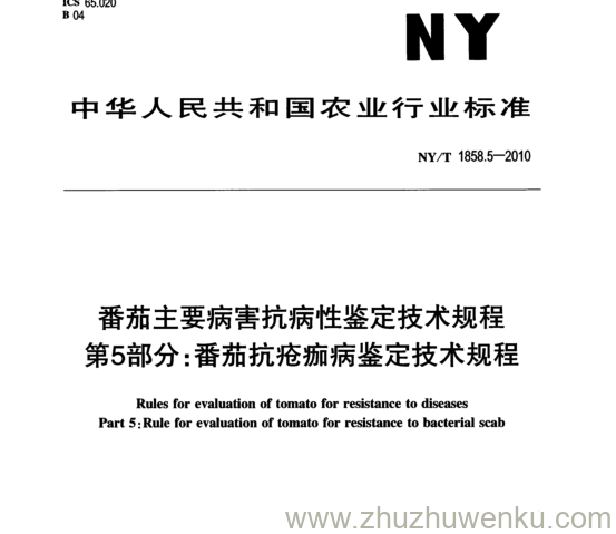 NY/T 1858.5-2010 pdf下载 番茄主要病害抗病性鉴定技术规程 第5部分: 番茄抗疮痂病鉴定技术规程。 Rules for evaluation of tomato for resistance to diseases Part 5 : Rule for evaluation of tomato for resistance to bacterial scab.
