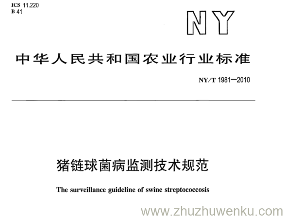 NY/T 1980-2010 pdf下载 猪链球菌病监测技术规范。 The surveillance guideline of swine streptococcosis .