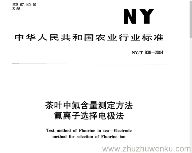 NY/T 838-2004 pdf下载 茶叶中氟含量测定方法 氟离子选择电极法。 Test method of Fluorine in tea- Elctrode method for selection of Fluorine ion .
