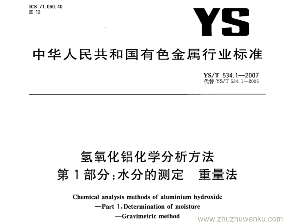 YS/T 534.1-2007 pdf下载 氢氧化铝化学分析方法 第1部分:水分的测定 重量法。Chemical analysis methods of aluminium hydroxide
