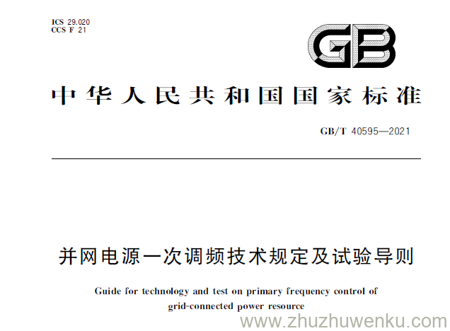 GB/T 40595-2021 pdf下载 并网电源一次调频技术规定及试验导则。Guide for technology and test on primary frequency control of grid-connected power resource.