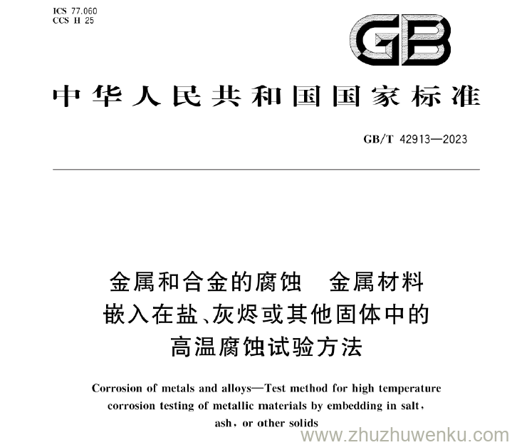GB/T 42913-2023 pdf下载 金属和合金的腐蚀 金属材料 嵌入在盐、灰烬或其他固体中的 高温腐蚀试验方法。