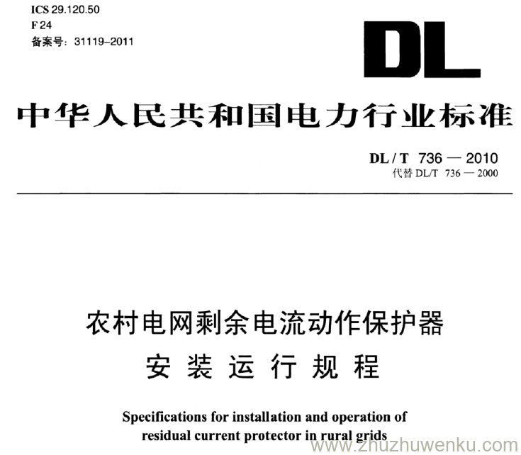 DL/T 736-2010 pdf下载 农村电网剩余电流动作保护器 安装运行规程。Specifications for installation and operation of residual current protector in rural grids.