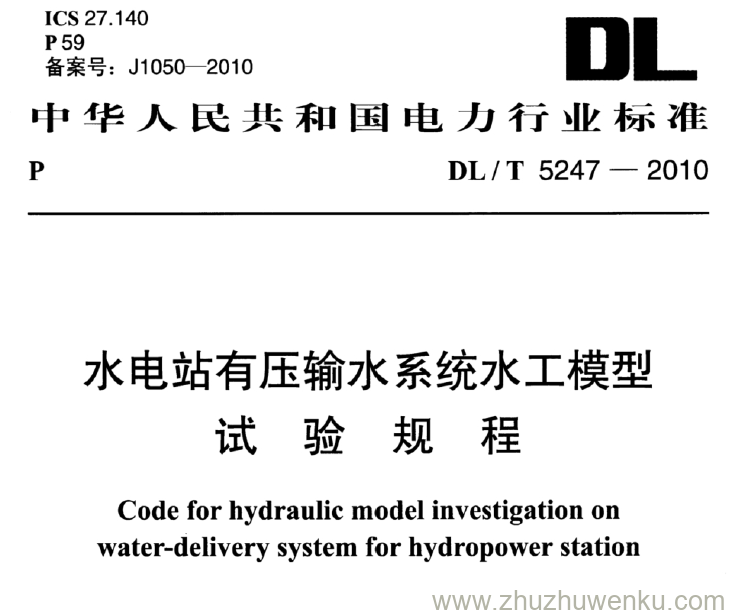 DL/T 5247-2010 pdf下载 水电站有压输水系统水工模型 试验规程。Code for hydraulic model investigation on water-delivery system for hydropower station.