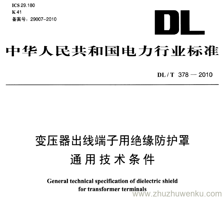本标准DL/T 378-2010规定了变压器出线端子用绝缘防护罩的定义、命名、使用条件、试验方法、检验规则、包装、运输和储存。
