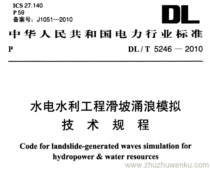 DL/T 5246-2010 pdf下载 水电水利工程滑坡涌浪模拟 技术规程。Code for landslide-generated waves simulation for hydropower water resources.