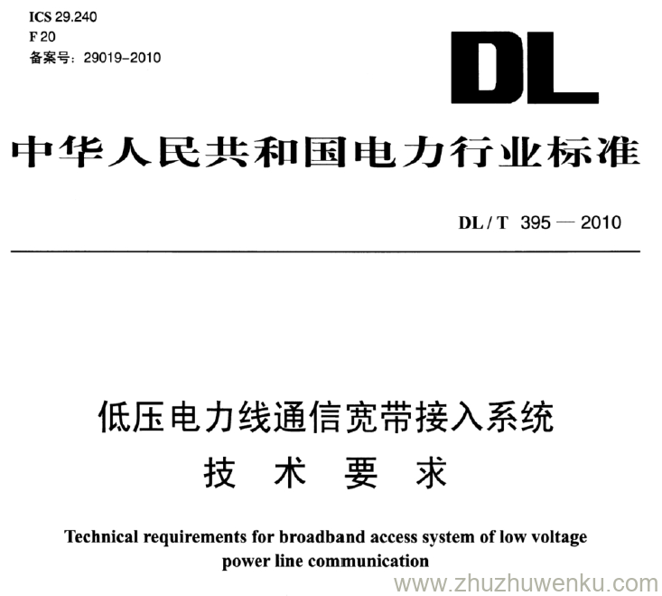 本标准DL/T 395-2010规定了低压电力线通信宽带接入系统的网络结构、传输性能、系统功能、通信协议、网管功能、安全性能、电源和应用环境。