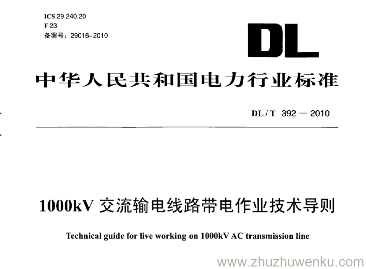 DL/T 392-2010 pdf下载 1000kV交流输电线路带电作业技术导测。Technical guide for live working on 1000kV AC transmission line.