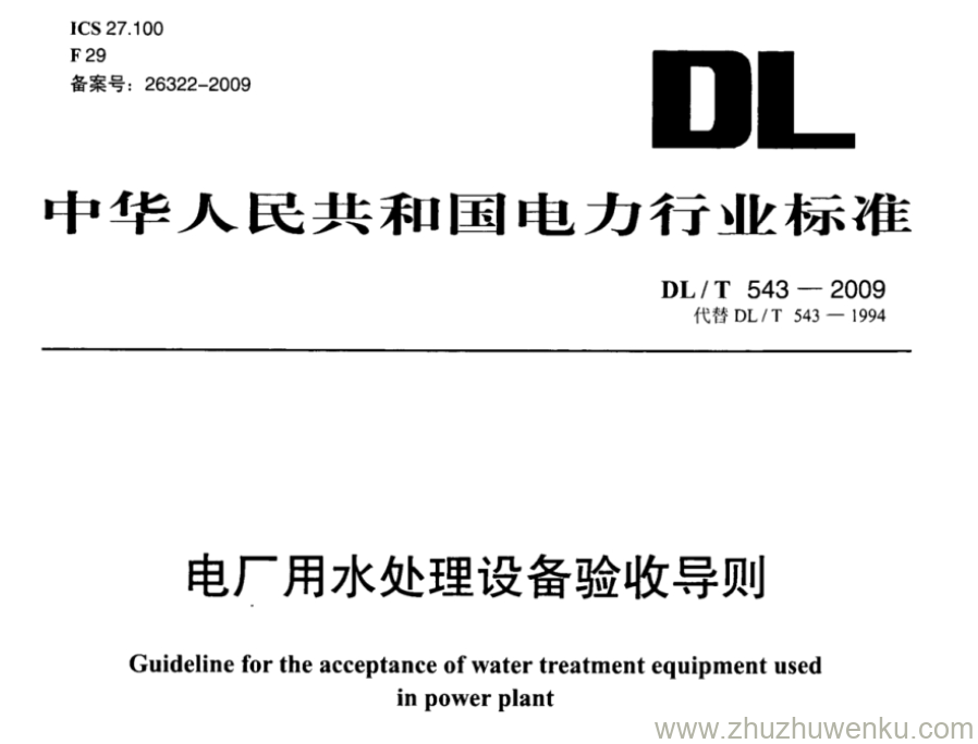 本标准DL/T 543-2009规定了电厂用水处理设备验收的检验方法及技术要求。