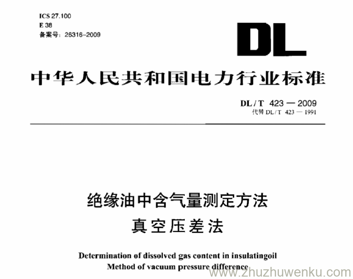 DL/T 423-2009 pdf下载 绝缘油中含气量测定方法 真空压差法。Determination of dissolved gas content in insulatingoil Method of vacuum pressure difference.