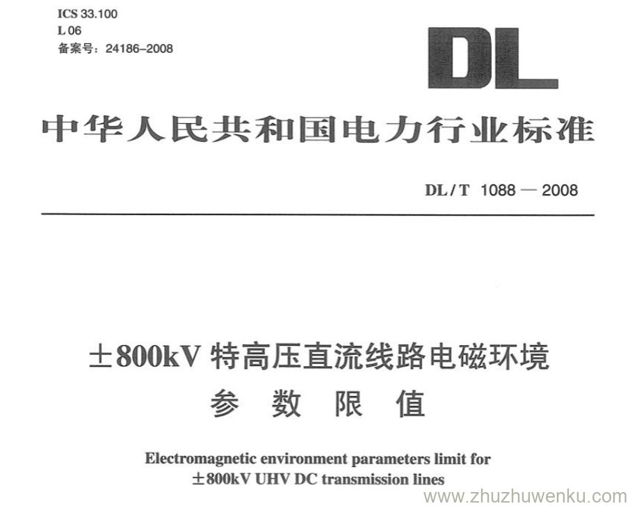 DL/T 1088-2008 pdf下载 ±800kV特高压直流线路电磁环境 参数限值。Electromagnetic environment parameters limit for ±800kV UHV DC transmission lines.
