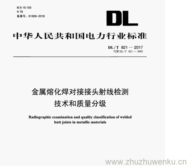 DL/T 821-2017 pdf下载 金属熔化焊对接接头射线检测 技术和质量分级。Radiographic examination and quality classification of welded butt joints in metallie materials.