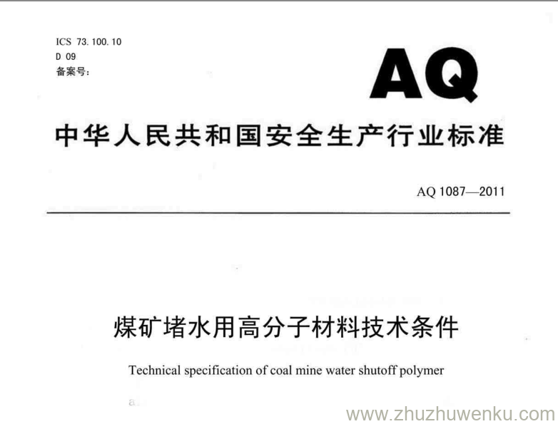 AQ 1087-2011 pdf下载 煤矿堵水用高分子材料技术条件。Technical specification of coal mine water shutoff polymer.