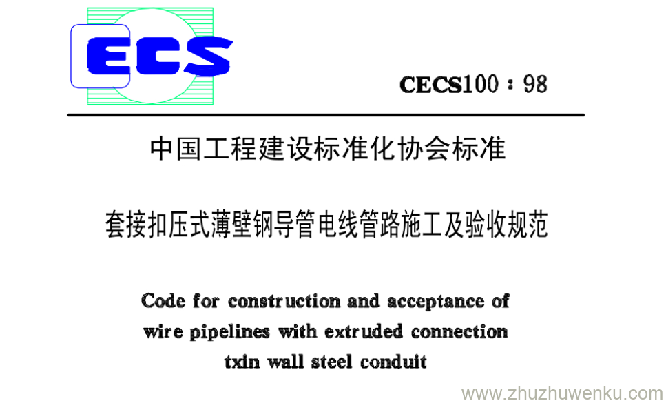 CECS100:98 pdf下载 套接扣压式薄壁钢导管电线管路施工及验收规范。Code for construction and acceptance of wire pipelines with extruded connection txin wall steel conduit.