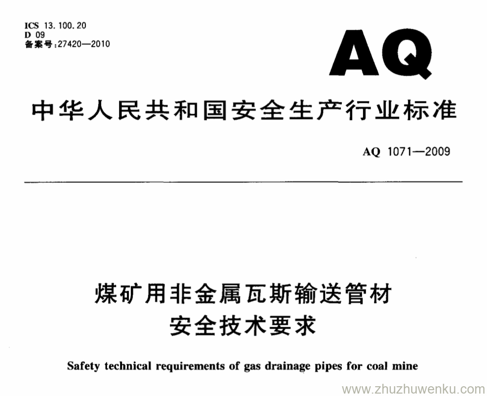 AQ 1071-2009 pdf下载 煤矿用非金属瓦斯输送管材安全技术要求。Safety technical requirements of gas drainage pipes for coal mine.