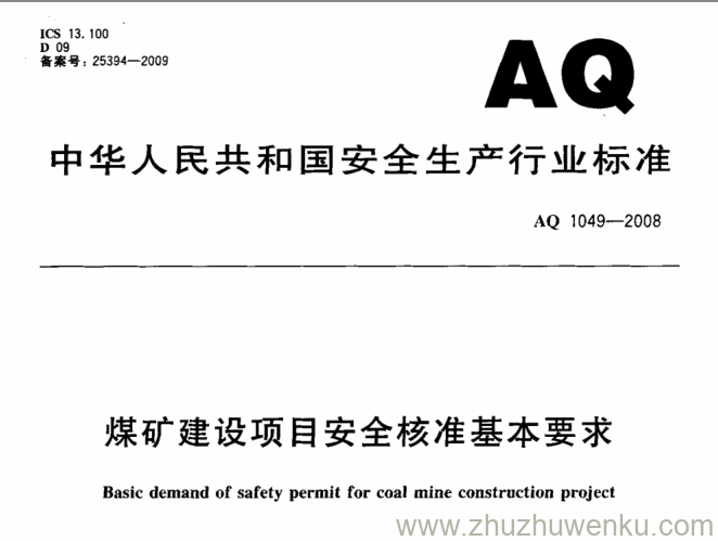 AQ 1049-2008 pdf下载 煤矿建设项目安全核准基本要求。Basic demand of safety permit for coal mine construction project.