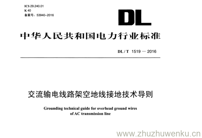DL/T 1519-2016 pdf下载 交流输电线路架空地线接地技术导则。Grounding technical guide for overhead ground wires ofAC transmission line.