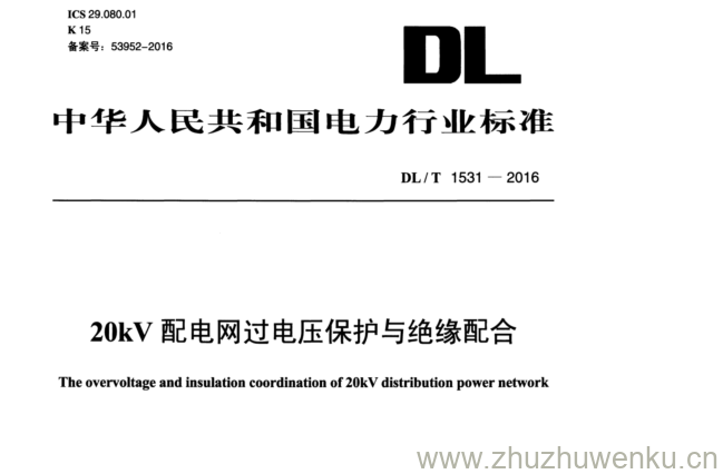 DL/T 1531-2016 pdf下载 20kV 配电网过电压保护与绝缘配合。The overvoltage and insulation coordination of 20kV distribution power network.
