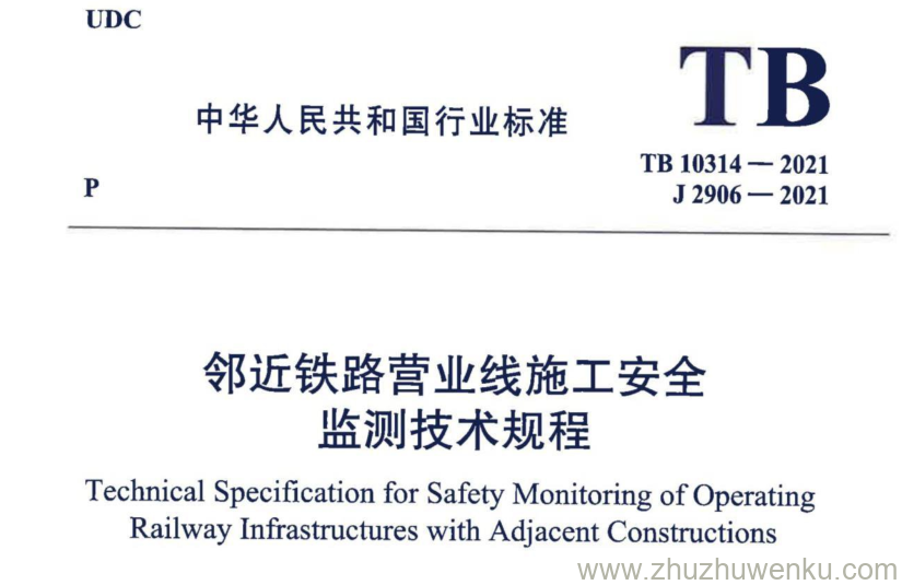 TB 10314-2021 pdf下载 邻近铁路营业线施工安全监测技术规程。Technical Specification for Safety Monitoring of Operating Railway Infrastructures with Adjacent Constructions.