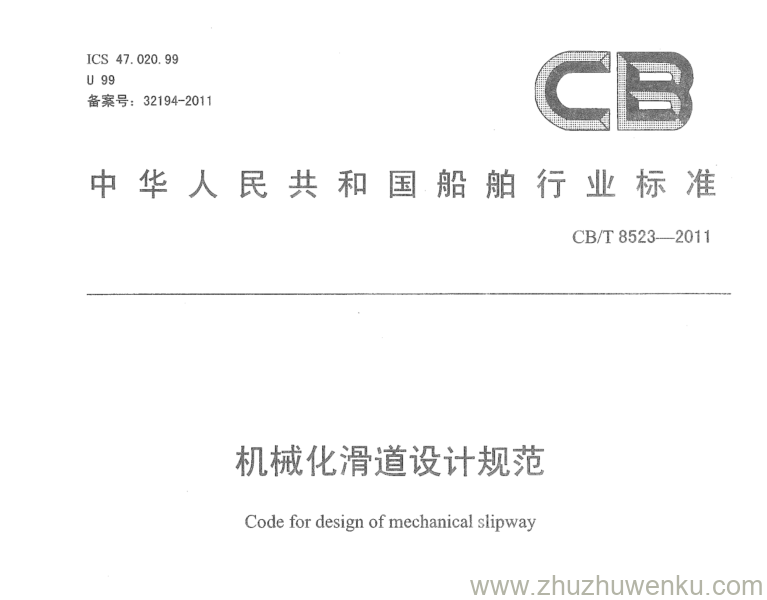 CB/T 8523-2011 pdf下载 机械化滑道设计规范。Code for design of mechanical slipway.