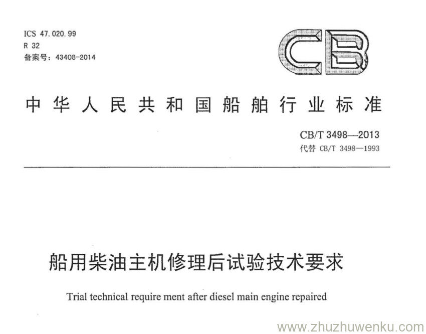 CB/T 3498-2013 pdf下载 船用柴油主机修理后试验技术要求。Trial technical require ment after diesel main engine repaired.