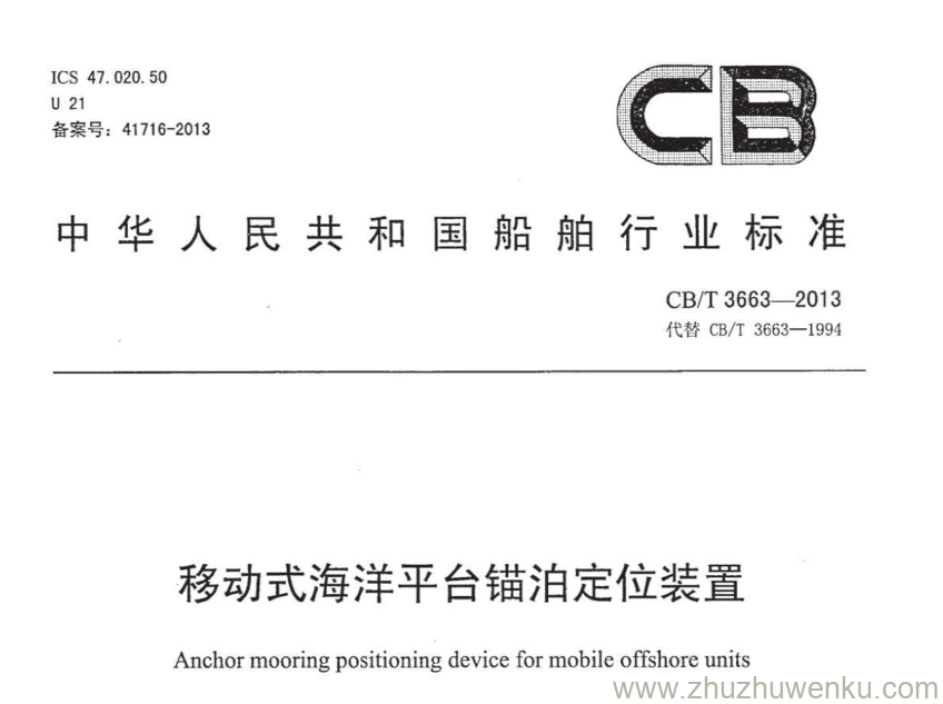 CB/T 3663-2013 pdf下载 移动式海洋平台锚泊定位装置。Anchor mooring positioning device for mobile offshore units.