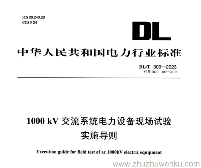 DL/T 309-2023 pdf下载 1000kV交流系统电力设备现场试验实施导则。