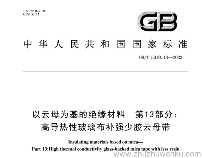 GB/T 5019.13-2023 pdf下载 以云母为基的绝缘材料 第13部分:高导热性玻璃布补强少胶云母带。