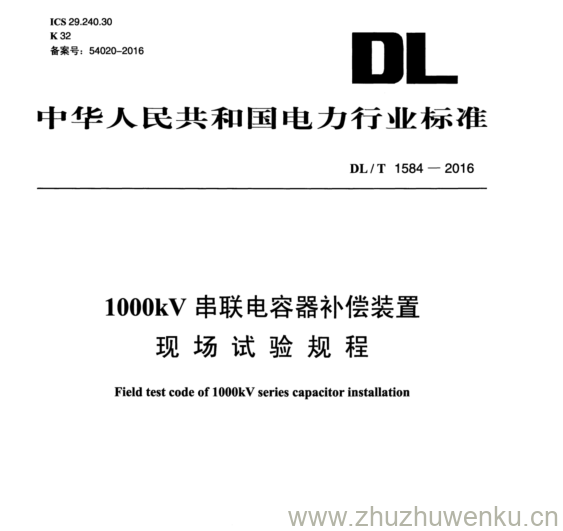 DL/T 1584-2016 pdf下载 1000kV 串联电容器补偿装置 现场试验规程。Field test code of 1000kV series capacitor installation.