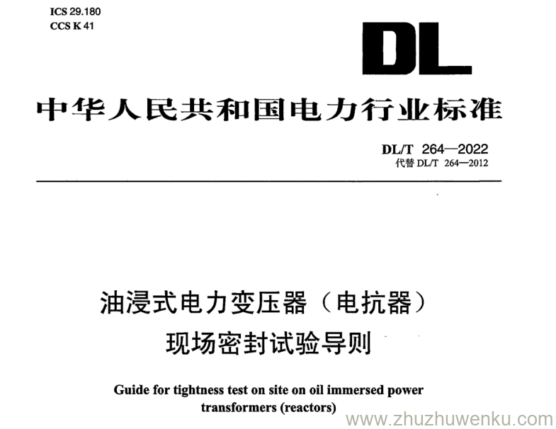 DL/T 264-2022 pdf下载 油浸式电力变压器(电抗器)现场密封试验导则。
