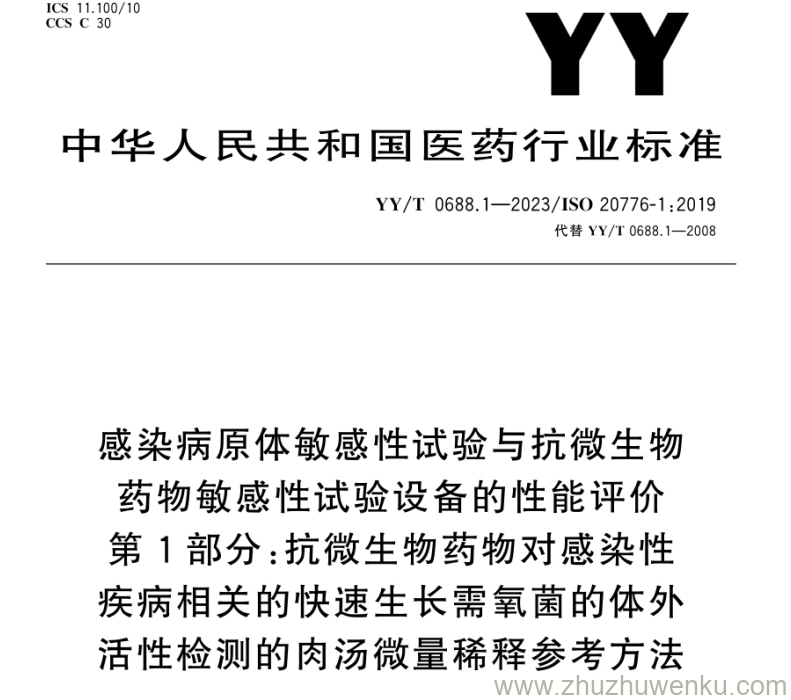 YY/T 0688.1-2023 pdf下载 感染病原体敏感性试验与抗微生物药物敏感性试验设备的性能评价 第1部分:抗微生物药物对感染性疾病相关的快速生长需氧菌的体外活性检测的肉汤微量稀释参考方法。