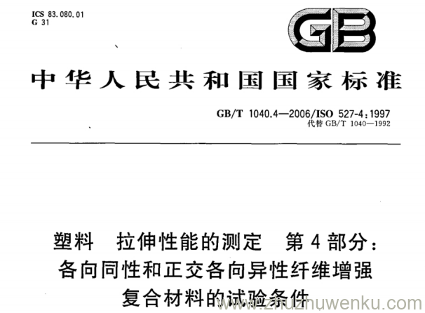 GB/T 1040.4-2006 pdf下载 塑料 拉伸性能的测定 第4部分:各向同性和正交各向异性纤维增强复合材料的试验条件