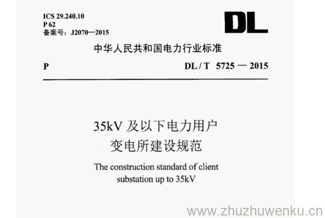 DL/T 5725-2015 pdf下载 35kV 及以下电力用户 变电所建设规范。The construction standard ofclient substation up to 35kV.