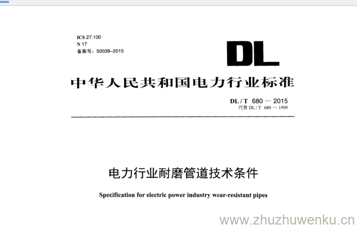 DL/T 680-2015 pdf下载 电力行业耐磨管道技术条件。Specification for electric power industry wear-resistant pipes.