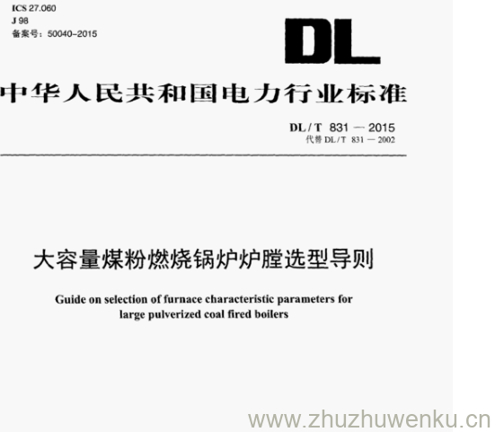 DL/T 831-2015 pdf下载 大容量煤粉燃烧锅炉炉膛选型导则。Guide on selection of furnace characteristic parameters for large pulverized coal fired boilers.