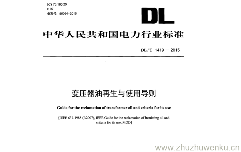 DL/T 1419-2015 pdf下载 变压器油再生与使用导则。Guide for the reclamation of transformer oil and criteria for its use NEFE 637-1985(R2007)IEEE Guide for the reclamation ofinsulating oil and criteria for its use, MOD].