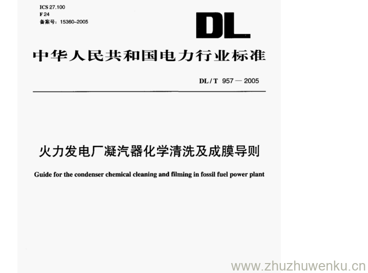 DL/T 957-2005 pdf下载 火力发电厂凝汽器化学清洗及成膜导则。Guide for the condenser chemical cleaning and filming in fossil fuel power plant.