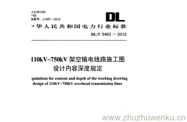 DL/T 5463-2012 pdf下载 110kV~750kV架空输电线路施工图 设计内容深度规定。gulations for content and depth of the working drawing design of 110kV~750kV overhead transmission lines.