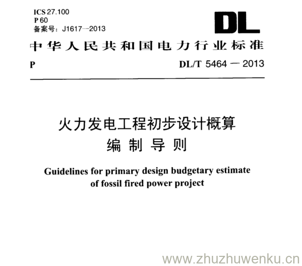 DL/T 5464-2013 pdf下载 火力发电工程初步设计概算 编制导则。Guidelines for primary design budgetary estimate of fossil fired power project.