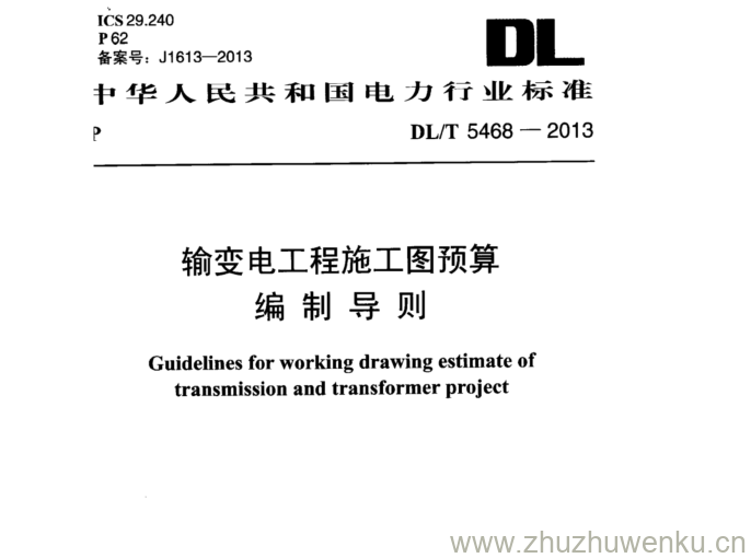 DL/T 5468-2013 pdf下载 输变电工程施工图预算 编制导则。Guidelines for working drawing estimate of transmission and transformer project.