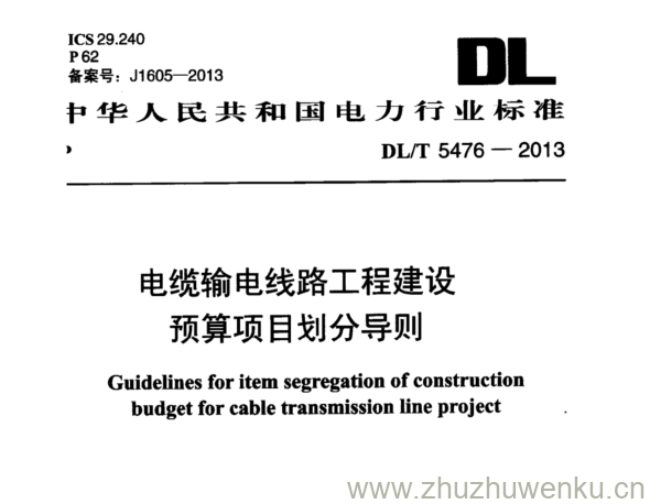 DL/T 5476-2013 pdf下载 电缆输电线路工程建设 预算项目划分导则。Guidelines for item segregation ofconstruction budget for cable transmission line project.