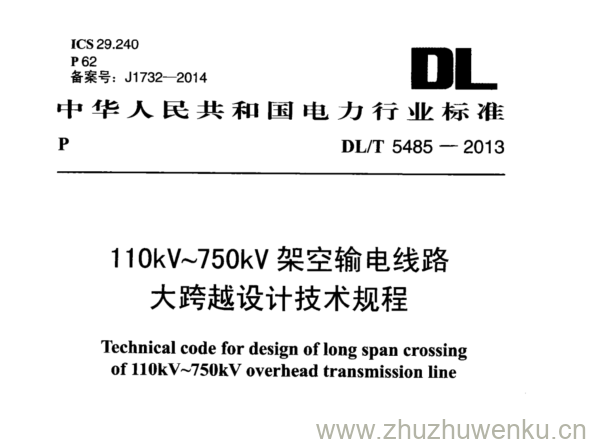 DL/T 5485-2013 pdf下载 110kV~750kV架空输电线路 大跨越设计技术规程。Technical code for design of long span crossing of 110kV~750kV overhead transmission line.