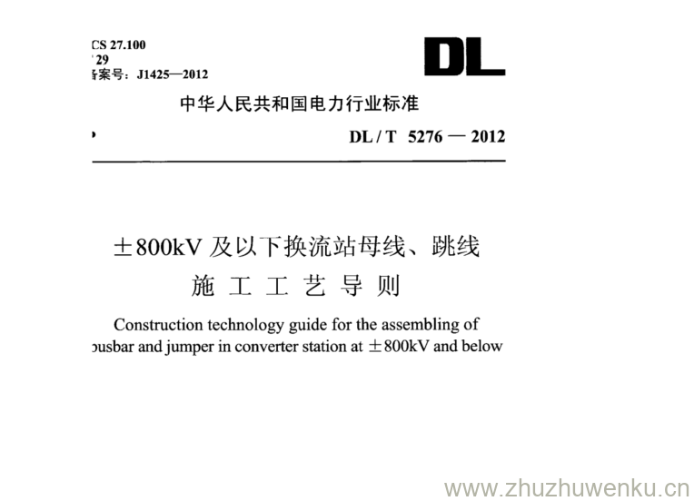 DL/T 5276-2012 pdf下载 士800kV 及以下换流站母线、跳线 施工工艺导则。Construction technology guide for the assembling of ousbar and jumper in converter station at ±800kV and below.