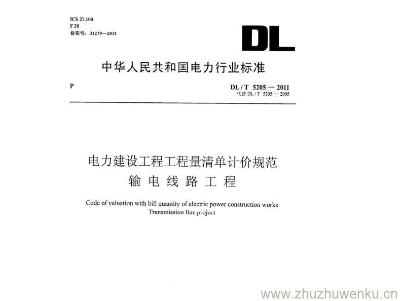 DL/T 5205-2011 pdf下载 电力建设工程工程量清单计价规范 输电线路工程。Code ofvaluation with bill quantity ofelectric power construction works Transmission line project.